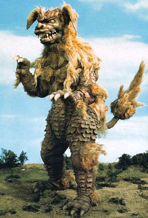 Ugg, what a pathetic monster. Imagine the biggest floppy-eared Pekinese you have ever seen, or one of those Foo Lions you see dancing in Chinese parades. His fur is shaggy and his teeth are pointy and he has three claws per hand (without a thumb one wonders how he picks up anything). He's about the size of Godzilla but obviously vastly lighter on his feet. His sole special power is the ability to absorb energy beams projected at him in his right eye, and re-direct them back at his adversary through his left eye!!!!!
