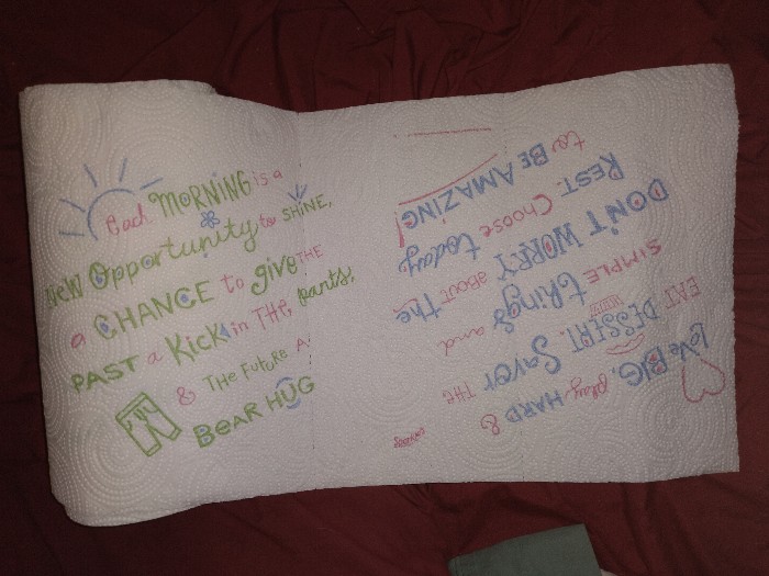 I went to the pantry for some spray cleaner, sponges, a mop and a bucket and a few other things I might need to clean up after my nine cats, whom I love and adore from the deepest wells of my soul but who also know how to make a fucking mess, and that's when I noticed that there were inspirational quotes printed on the paper towels.