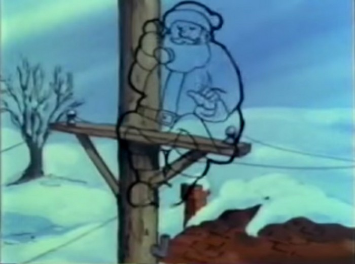 As soon as she mentions the name Santa Claus the children all panic and scatter. Jeffy ends up behind a curtain, and when he looks out the big picture window he's standing in front of he sees the transparent form of the jolly red tyrant again, this time taking Mommy's call at the top of a utility pole.