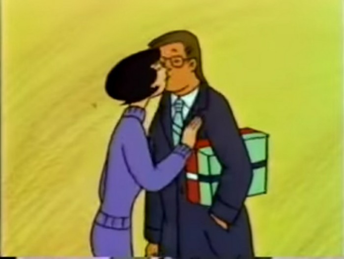 Daddy gets home from work, looking crushed and soulless from a long hard day of coggin' in the wheels of the integrated theo-civic industrial complex, and the kids come up one by one to nag and harass him about presents and making snowmen and decorating the tree. He deftly deflects all of their requests and concerns to go and get a little bit of sugar from his wife.