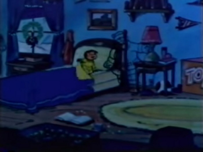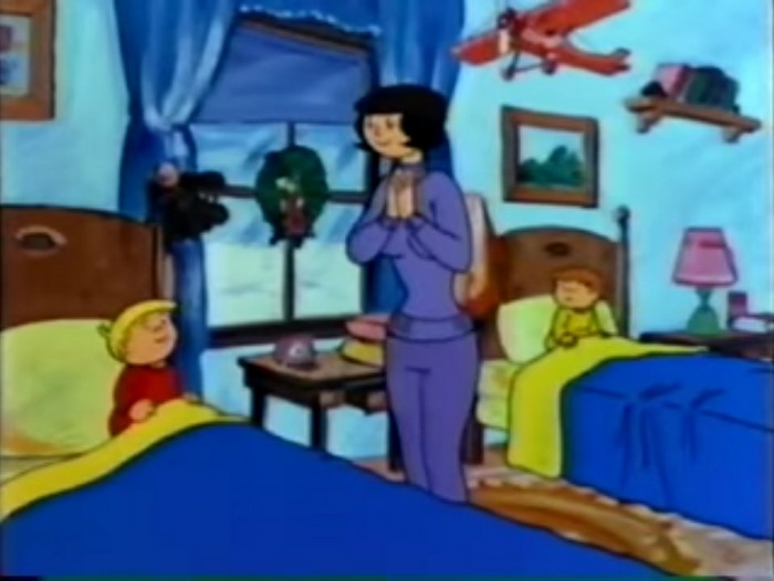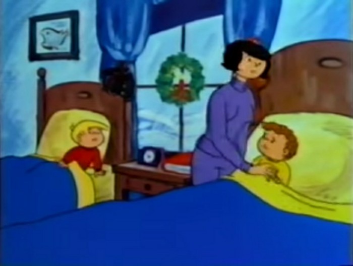Next we see Billy and Jeffy in their shared bedroom, and as Mommy tucks Billy into bed he observes that Daddy isn't having a very nice time this Christmas and that when he couldn't find the all-important star for the treetop "his eyes got watery." Mommy explains that Daddy's got conjunctivitis, and also that his own father made that star ornament when he was just a little boy, that he used to love Christmas, singing songs and telling funny stories about Santa and his elves to make everyone laugh.