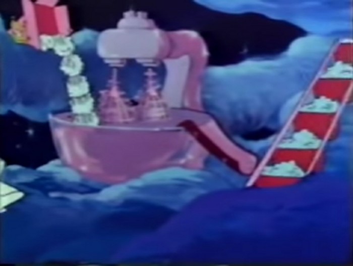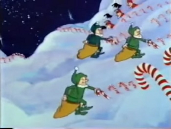 We see a bunch of giant candy canes sticking out of a cloud and Jeffy stares in mesmeric joy as a bunch of elves pick up normal-size candy canes off the ground all around them. Santa says they need to harvest them "before the dust storm comes...we don't want our candy canes to get dusty!"