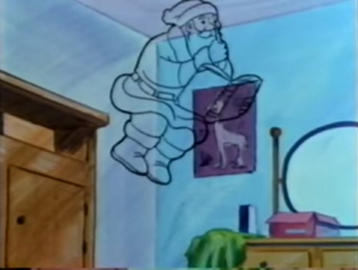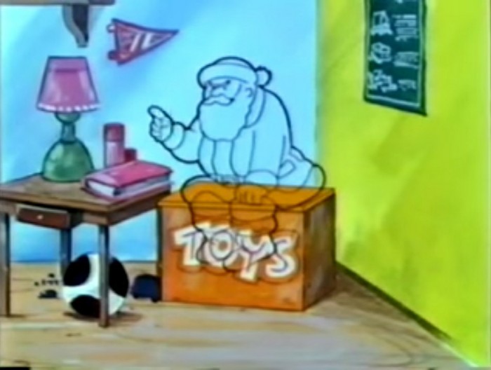 Jeffy is suitably traumatized by this unspoken threat of festive death-squad retribution and runs to his room to hide under the bed with the scruffy little dog Sam. When he pokes his head back out he sees a ghostly Santa Claus sitting on a toy chest and angrily wagging a finger at him.