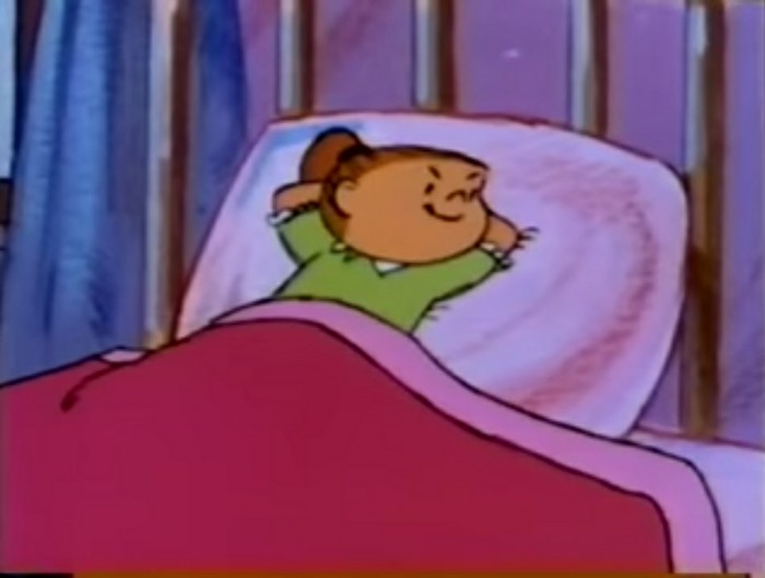 When we return Mommy is tucking Dolly into bed, and Dolly is lamenting that Jeffy is going to be mighty disappointed when Granddad doesn't show up. Mommy agrees and decides she'd better go try to explain it to the the little tow-headed asshole. As mommy exits Dolly puts her hands behind her head, arches her eyebrows maliciously and says "I wonder if Mommy is going to scold Jeffy," except it sounds like she says "scald," and I have to wonder if that tootling flute is actually a steaming tea kettle.
