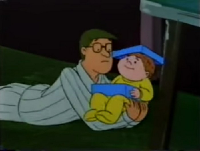 Now we get some alleged domestic comedy where Daddy tries to read to them but can't get past the first line without being interrupted with various questions, complaints and observations like "Can I turn the page?" "My doll can't see the book!" and "When you hit a hobo in the head with a shovel his eyes roll back real good."
