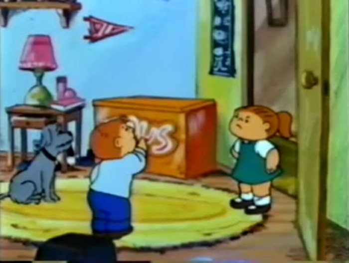 The two brats pass by the open doorway to the room where Mommy keeps her sewing machine and Dolly whispers to Jeffy that they should go have a peep in the gift-filled closet, which is standing temptingly half-open at the opposite end of the chamber in what is doubtless an attempt by their parents to entrap them. Jeffy knows they're not supposed to go in, but Dolly is defiant, saying they'll just look at the boxes and not touch anything. As soon as they get there, however she picks up a small box labelled for Jeffy and tries to hand it to him.