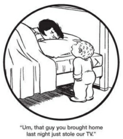 As Jeffy struggles up the rickety pile, we see Daddy waking up confusedly in his bedroom down the hall, not too spent apparently from his perfunctory lovemaking to hear the tinkling noise of the xylophone beneath Jeffy's feet.
