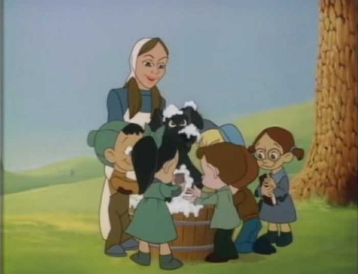 She promises she won't tell and will just have to pretend she doesn't know the dog is there, but then she immediately goes outside and gives the thing a bath in a big wooden tub, out by Mrs. Hopewell and in full view of the orphanage house where Mrs. Mavilda could just casually glance out a window and catch sight of them at any moment.
