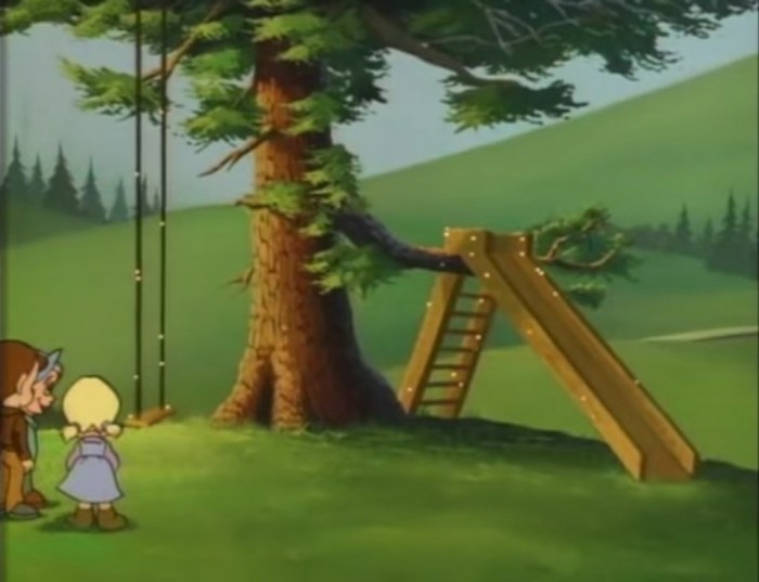 Now Judy decides to make Mrs Hopewell "more fun to be around." She spots some planks of wood piled up near the house and without asking Mavilda's permission she uses them to build a slide and a swing. We're given no word on where she found the saw, hammer and nails, or how she managed to do it all in one afternoon, ostensibly in a mere couple of hours.