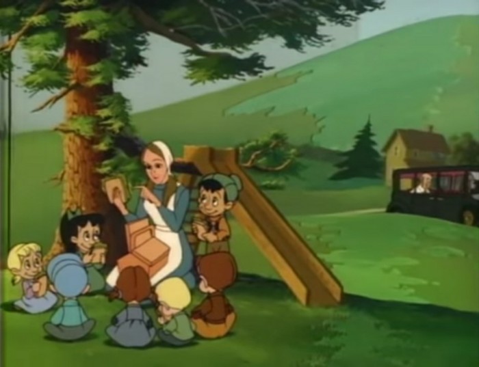 The Mayor drives past one day to find Judy and the Orphans out under Mrs. Hopewell. As he nods approvingly and mutters something about what a fine woman she is to take such good care of the children, I can't help but notice that in every other scene, where the Mayor doesn't need to be able to see Mrs. Hopewell easily from his car for sketchy plot purposes, the tree has been way out behind the building on the crest of a hill, but now it's only about ten yards from the house and no more than fifty feet from the road.