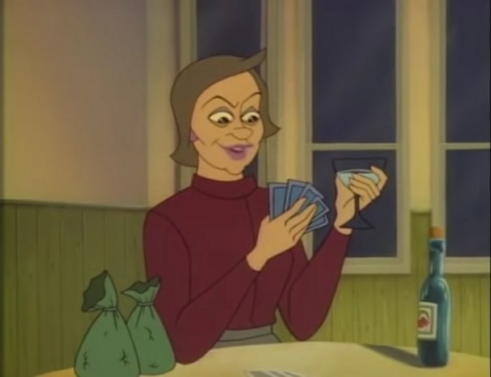 Meanwhile Mavilda is drinking wine and playing poker with her pals, and eventually she just pushes the two big bags of cash to center of the table and loses her whole wad in one shot.