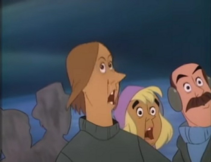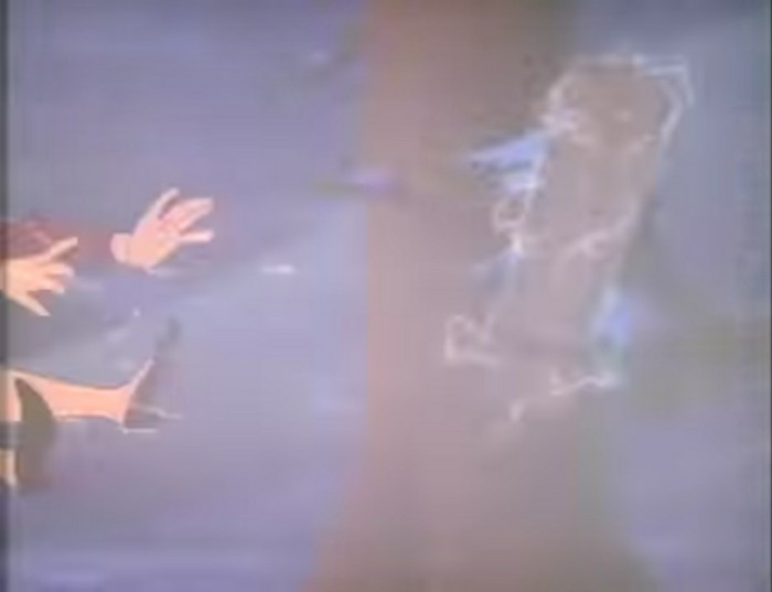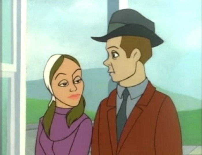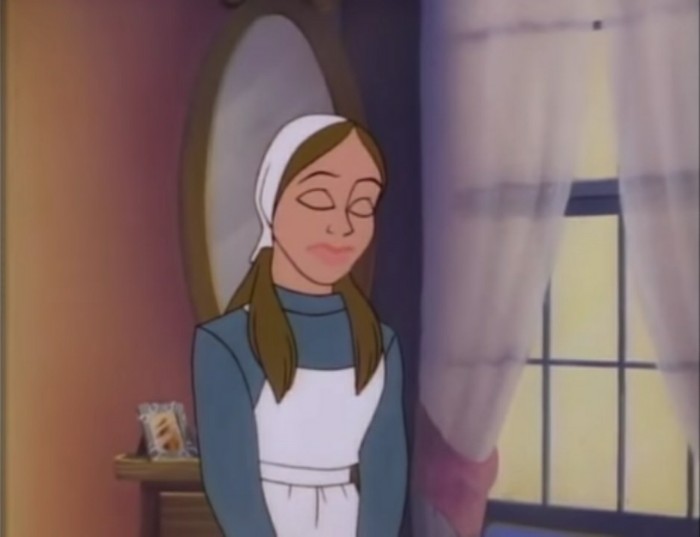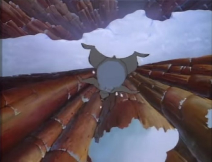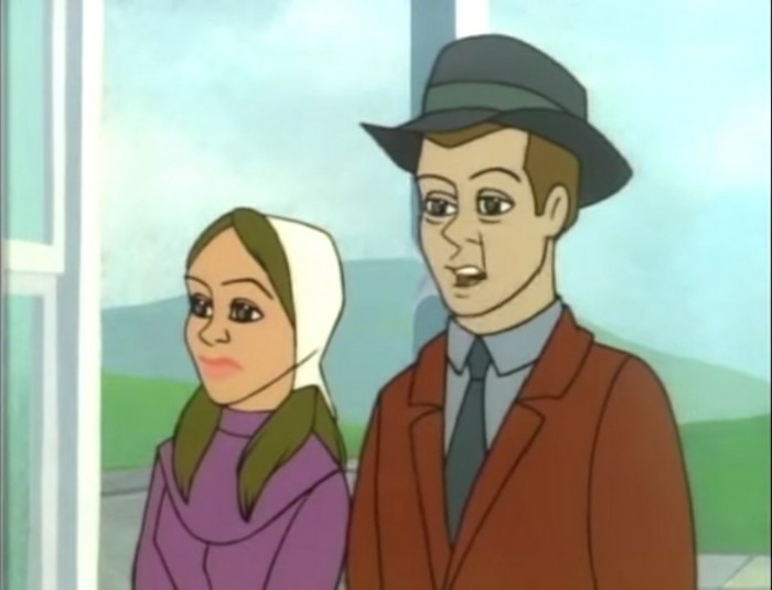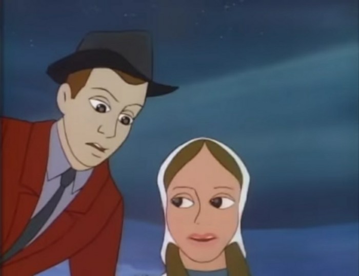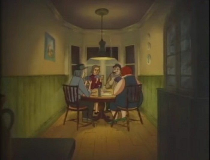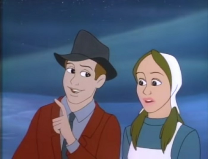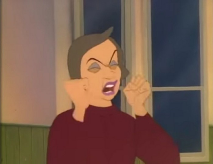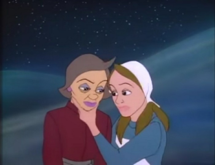 Nothing moves properly, in any kind of smooth or believable way, and zero effort has been made to synch up any of the words with the characters' mouths. It's kind of like the limited frame animation you see in particularly cheap TV anime, but it's even less fluid with lots of weird, jerky-wobbly artifacts. The tempo of the dialog speeds up and slows down, as if they filmed the animation first without considering how much time the lines of the script might take to deliver, then had to rush or stretch them to fit whatever space they already had on film.