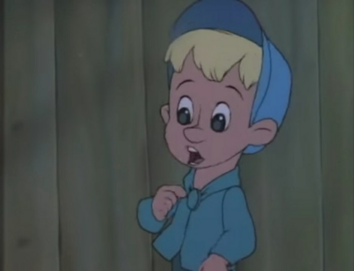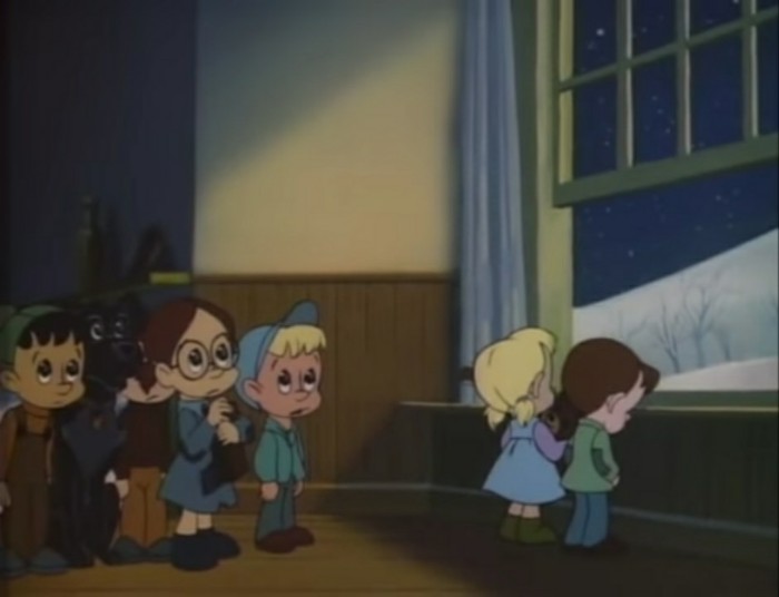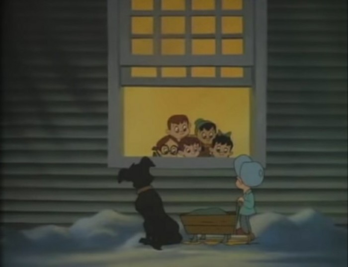 A kid with patches on his elbows buys into this last-ditch fantasy, however and decides to go to the window and change his Christmas wish, too. Instead of the bicycle he'd asked for he wishes that Judy might be saved from Mavilda's duplicitous sheme.