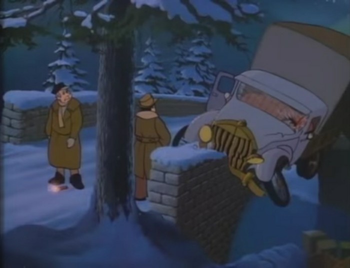 By an amazing stroke of unbelievable luck the Mayor himself drives up at this very moment, with Judy's husband in the back seat of the car. As the Mayor ambles up the hill, expressing his confusion at these unorthodox Christmas Eve Shenanigans, Pappy and Licorice return, and Judy suddenly remembers that, oh yeah, she has children that had been missing all night! Daddy is a little more on the ball about it, apparently because as soon as he pokes his face into frame he asks where the hell Lily is.