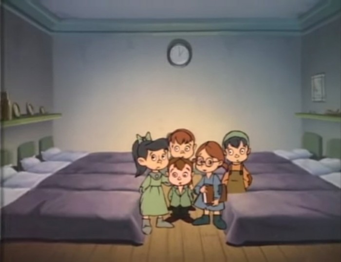 So the two new kids are left in the barracks with the rest of the riff-raff, and there's a long, awkward pause as they sit on the bed with the others staring at them, no one quite knowing what to say. The girl, Lily has a little teddy bear that only has one arm, and she asks the other children if they'd like to hold it. This breaks the ice, and the Orphans all smile and take turns holding the toy.