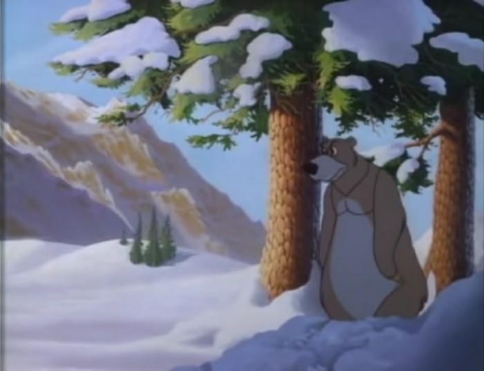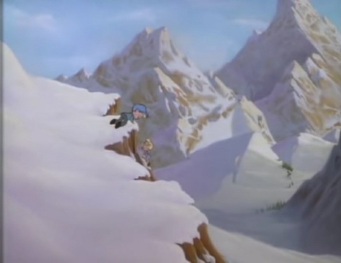 There is a desperate chase. Licorice pulls with all his might, but the bear gains on them. Lily throws the picnic basket at the bear's head, but it just pisses him off and he redoubles his efforts. Eventually they get cornered at the edge of a cliff with a steep, snowy decline on one side and a sheer drop on the other. As the dog fights off the ursine invader, Lily slips and ends up hanging on over the slope.