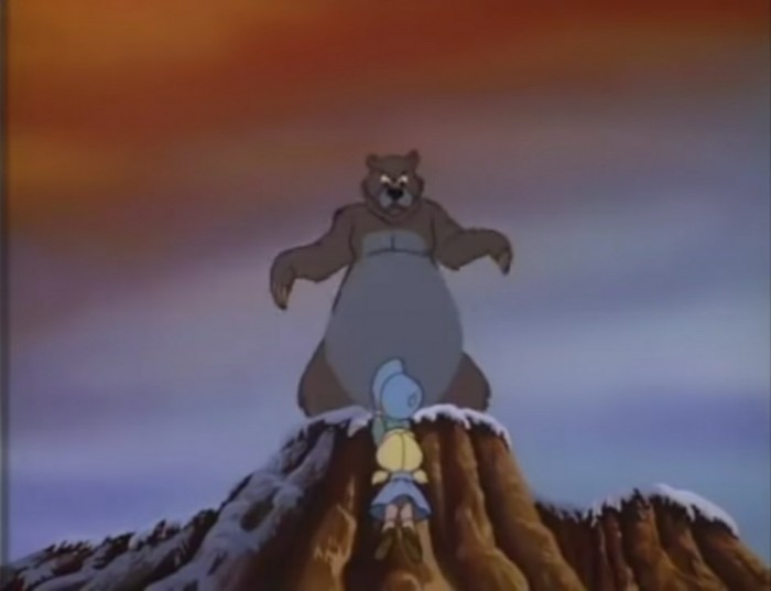Just as it looks like the siblings' goose is well and truly cooked Licorice shakes himself off and leaps onto the bear's back. Unfortunately Pappy can't keep his grip on his sister's hand and Lily slides away down the steep grade and into the misty ravine below. The bear fares even worse, though, as Licorice trips him up and sends him over the sheer cliff face on the other side of the ledge.