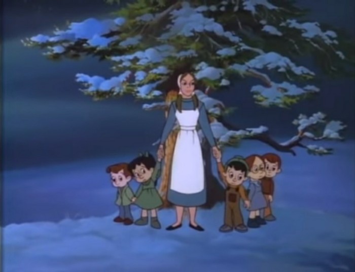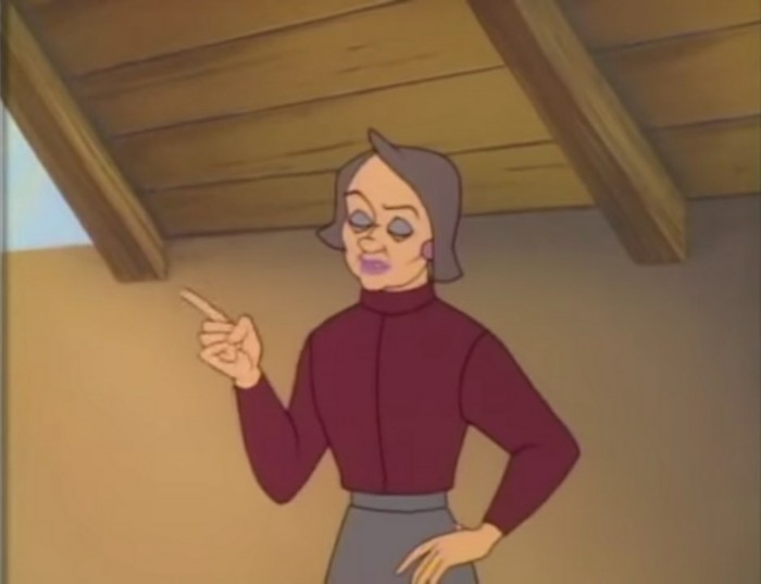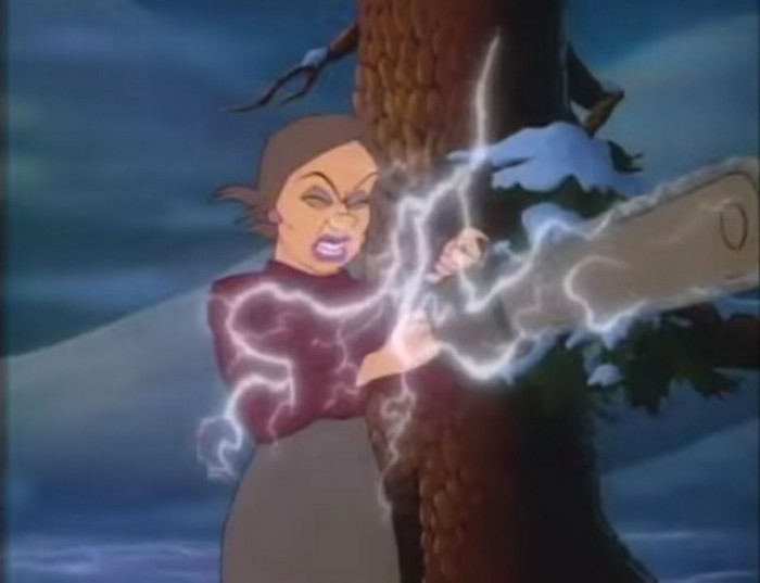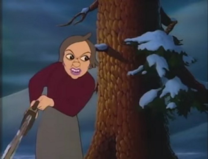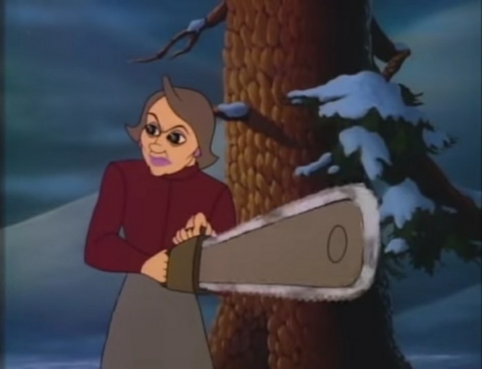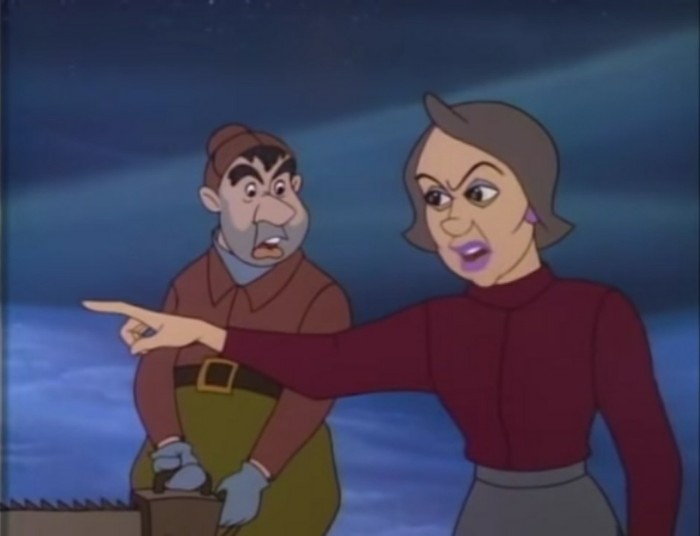 Back at the orphanage the children tell Judy about Pappy and Lily going off to the North Pole to find Santa, which you'd think would send her into a panic, but she just stands like a stump and listens calmly as the children explain that Mrs. Mavilda is going to chop down the tree and is planning to do "something mean" to get rid of her. Instead of immediately hopping in the car and alerting the authorities that her kids have run off alone into the frigid and unforgiving wilderness she squanders precious minutes slowly moseying upstairs to talk it over with Mavilda, who predictably gives absolutely zero fucks about Pappy and Lily and instead blames Judy for the entire debacle.