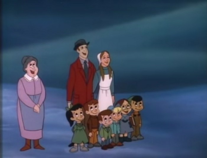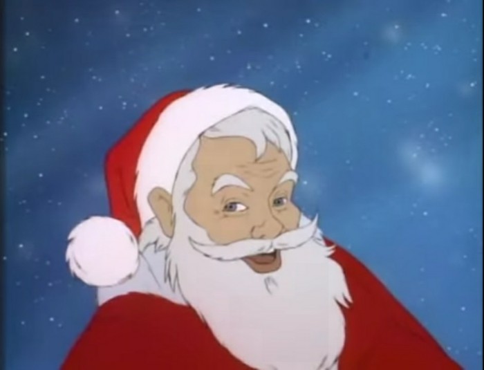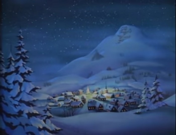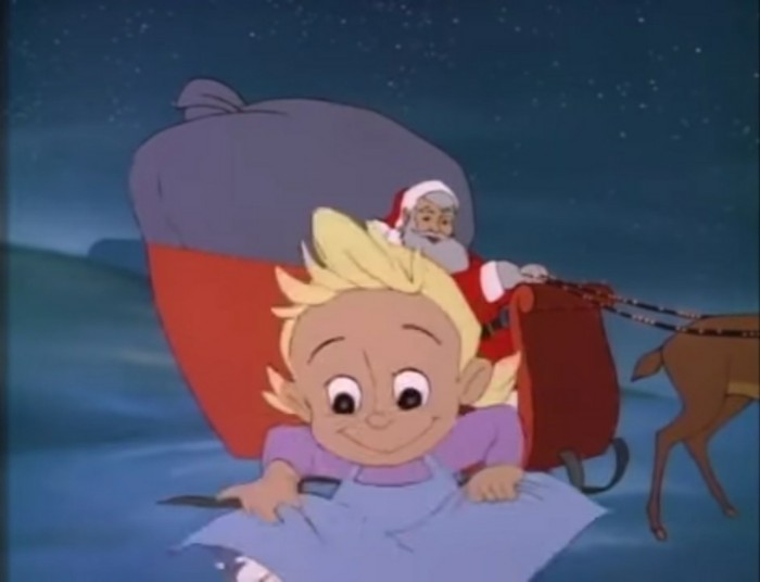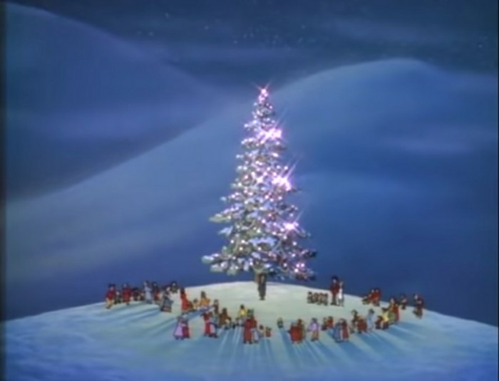 Now we hear distant bells and Santa appears in his sleigh in the distance. As he flies over he drops a little spakly magic dust on Mrs. Hopewell, causing a wild lightshow that probably took up half of the already meager budget and turning her into the biggest, most luscious, shiny Christmas Tree a third-rate animator with dwindling resources could muster.