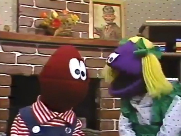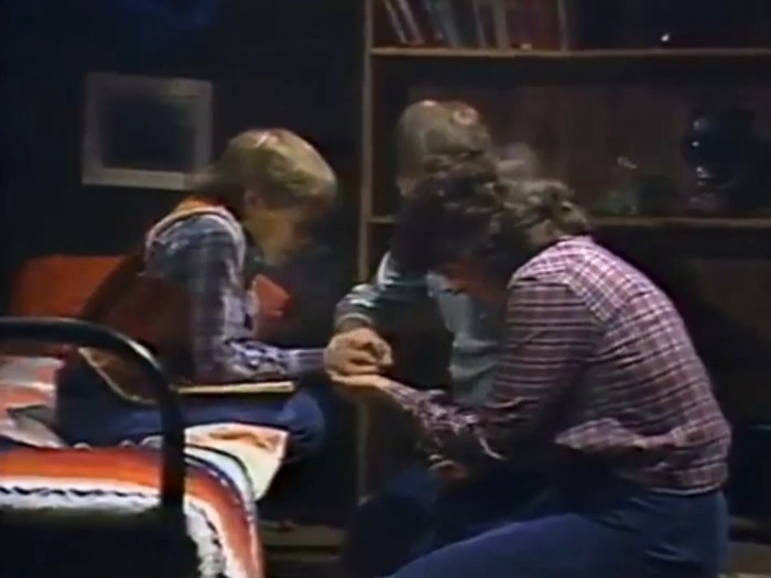 After a commercial break we get our first interstitial segment, featuring a felt-faced moppet named Oogene discussing the reproductive habits of kangaroos, featuring stock footage from some poorly funded Midwest zoo, wherein we learn that their babies are called Joeys, and that Joeys like to hang out in their mothers' pouches. He also explains how Joeys are born without rear legs but "slowly crawl with their front legs up from the birth canal and in the pouch," which is not something I was emotionally prepared to hear enthusiastically shouted by a Christian Fundamentalist puppet with a crimson butt-plug for a head.