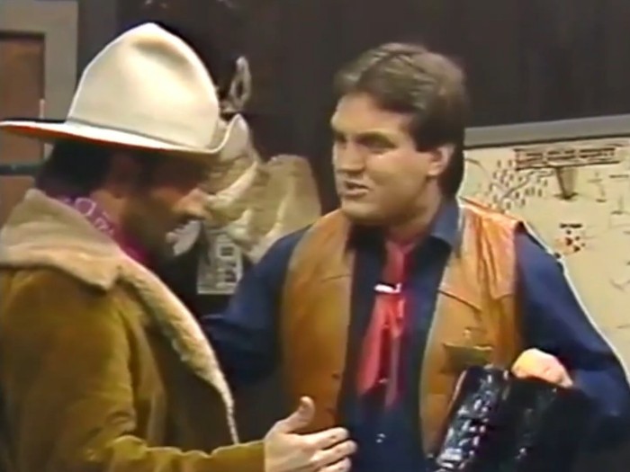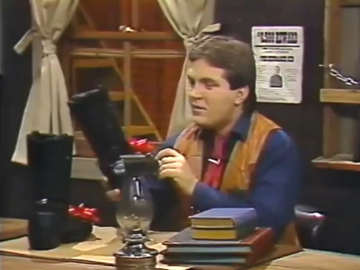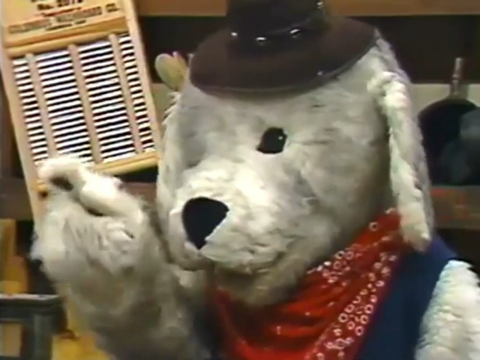 Over the years we've gotten a lot of Shitmas mileage--and no small portion of Shitmas joy--from Evangelical Christian children's TV batshittery. We’ve previously pilloried the bible-thumping robot cult of Colby’s Clubhouse (1984), the vocal-fry ramblings of plush loser Gerbert (1991), the psylocybin-inspired afterlife of The Littlest Angel, (1969) and the snooze-inducing, unintentional homoeroticism of Davey and Goliath (1965). This year we bring you the rootin’, tootin’ bible verse spootin’ Gospel Bill, a sterling example of the “let’s indoctrinate ‘em young” variety of religious kiddie TV which aired on the Christian Broadcasting Network from 1981-1993. Produced by the Willie George Ministries of Tulsa, Oklahoma, the program takes place in the fictional wild west town of Dry Gulch, where the titular sheriff (played by Pastor Willie George himself) foils the schemes of itinerant bad actors and preaches the gospel of Jesus to the salt-of-the-earth locals and the impressionable fundie kids watching at home. Present also are his faithful deputy Nicodemus, local shop-keep Miss Lana, local dumbass Elmer Barnes, skinflint Mayor T. U. Tutwater and a giant anthropomorphic dog in a cowboy hat named Barkamaeus.