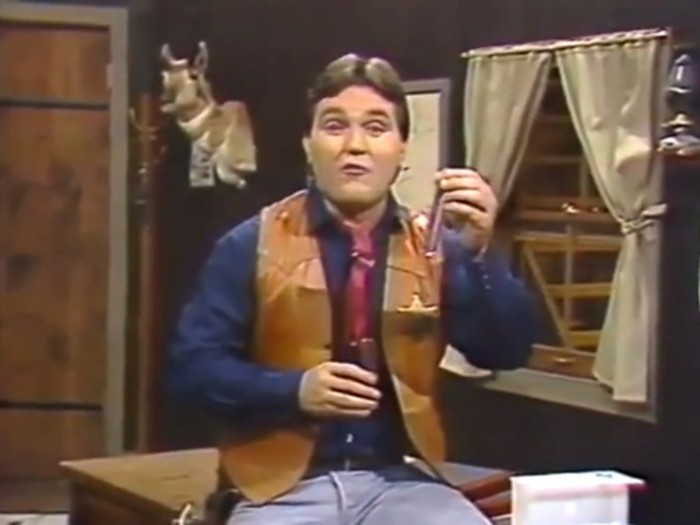 Now we head to another commercial, and when we return Gospel Bill is back at the Sheriff's office, sitting on the edge of the desk with a rack full of test tubes at his side, getting ready to do some chemically-enhanced pulpitry for the kiddies at home. Specifically, he has a dark liquid representing sin, and a clear liquid representing the blood of Jesus before it was shed, which he pours into a cloudy liquid representing nothing in particular beyond the need for a chemical reaction that would turn the first liquid red. Then he pours the red liquid into the black liquid, which turns it clear, demonstrating definitively that the blood of Christ, when carefully mixed in the proper proportions with your own filthy blood, washes your sins clear away.