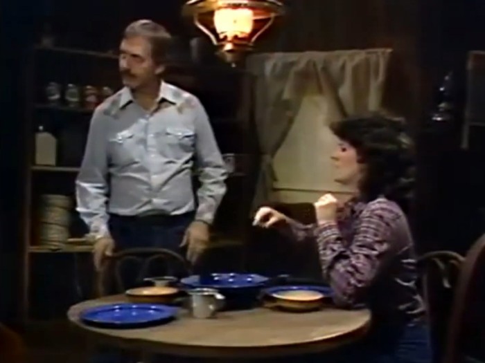 At this point in the dreary proceedings, I was getting pretty desperate for something more exciting than cowboys giving presents to each other to happen, so when it cut from Gospel Bill's nauseating display of condescension back to the outlaws Weasel and Monk I perked up, hoping to see an old timey wild west bank robbery replete with bandanna masks, errant gunfire and a terrified cashier with sleeve garters and wire-rimmed spectacles shaking in his boots, with the barrel of a Colt Navy revolver pressed to his sweat-beaded temple, shoveling cash into a burlap swag bag. Sadly, if any of this happened at all it happened off-camera, as when we join the two dirty dinguses it's clearly post-heist, with Monk boastfully declaring the First Bank of Dry Gulch the easiest bank he's ever seen. As he and his partner gloat, Barkamaeus comes stomping out of the shop to ask them what's going on. Monk shouts back at him "The bank just got robbed...and we robbed it!"