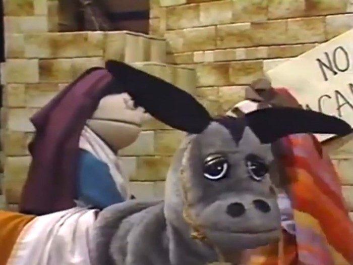 Now we abruptly cut away to the first of a pair of puppet reenactments set during the night of the first Christmas. Segment one is a fractious exchange between Joseph and a grumpy innkeeper, who tells the Earthly father of the Prince of Peace that he doesn't give one single fuck from his well-stocked fuck bucket that Mary is pregnant, and even if he did, he can't make an unoccupied room appear in his grubby little hostel just by snapping his greasy falafel-fingers and making a wish. He does, however, have a stable out back that has only a moderate amount of livestock feces strewn about its environs. If Joseph's wife doesn't mind her water breaking in a pile of sticky hay, he says they're welcome to it, for an extortionate price. The innkeeper heads inside and Mary comes galumphing up on her donkey, only to have Joseph break the news to her that they're gonna be sleeping in a cowpat that night.