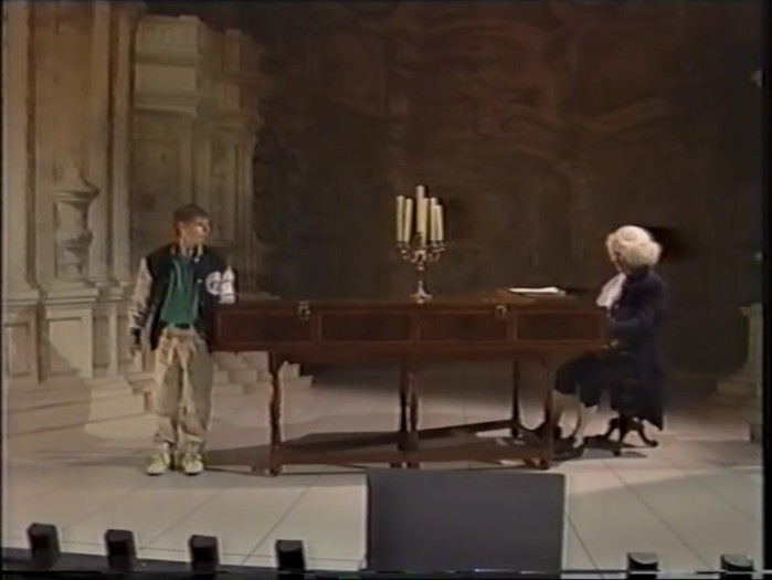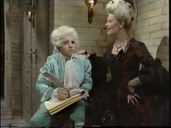 Now we get T. Bag's rendition of the "I'm a sucker for a blow" song, and if anything, she sings it even worse than her nemesis. The Archduke is back now and agrees with my assessment, but T. Bag insists it's not her voice that's the problem, but the music. It's boring, boring, boring, she cries, and the Archduke agrees with this assessment, too, but he laments that since it's the only opera they have handy they're stuck with it. This gives T. Bag an idea. She boldly claims she can get her hands on an opera that'll knock the monograms off his socks. His interest is piqued, and when he inquires further, she informs him that she knows of a great composer who's staying nearby and happens to be available to write them a far better opera that very afternoon: the great boy genius Wolfgang Amadeus Shirt.