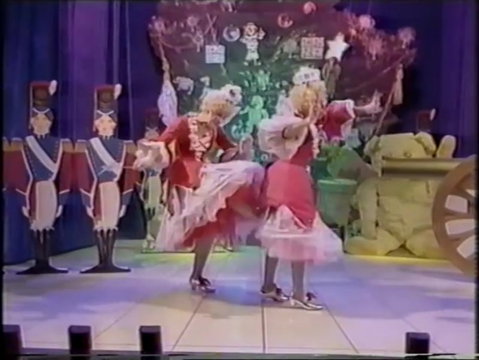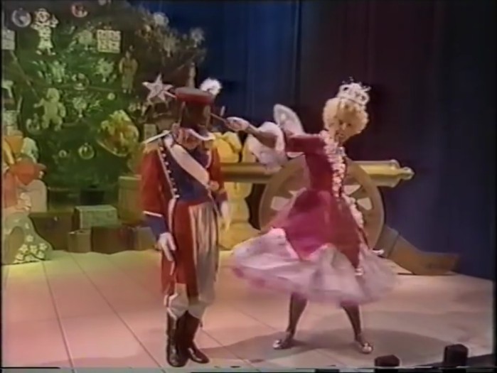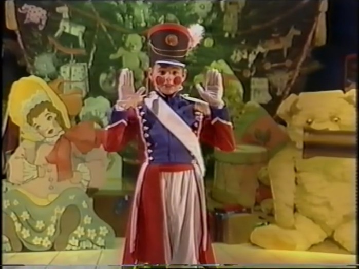As the curtain parts, we see that the action will take place beneath a Christmas tree. There are painted standees representing unopened presents, a baby doll, a teddy bear, a toy cannon and a line of wooden soldiers. The last of these soldiers is actually Shirt, who steps forward and begins to sing.