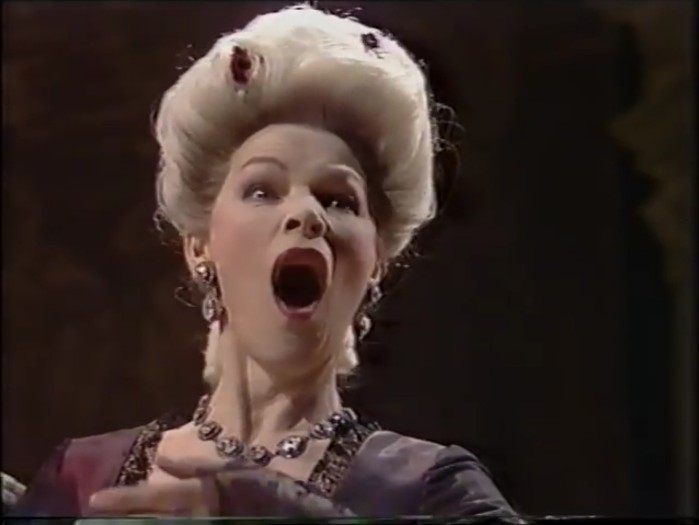 The Red Lady in comes in from the wings, prancing triumphantly, and lowers her mask to reveal, unsurprisingly, Glenda Jackson, who proceeds to bow to the Archduke as a prelude to muscling in to perform the aria herself.