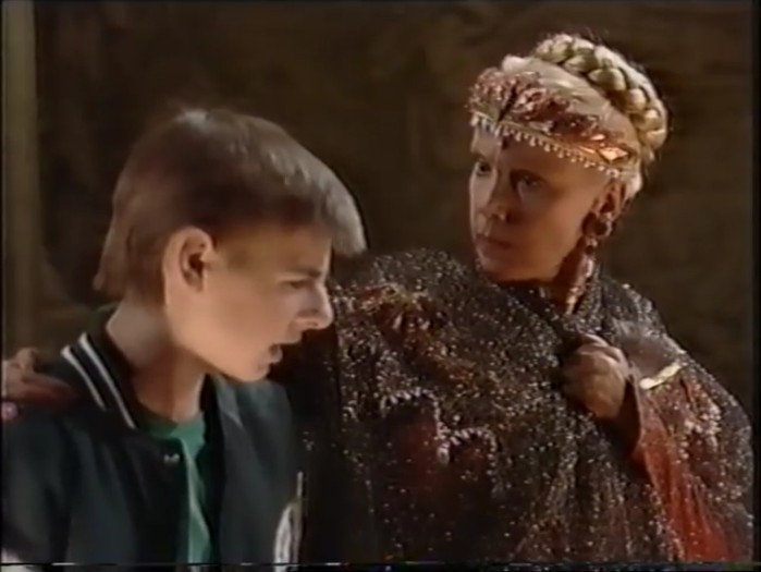 I'd never seen or even heard of the UK Granada TV program T. Bag (1985-92) before stumbling across it on a list of British Christmas specials just this morning. A modicum of research reveals that there were nine series and four stand-alone Christmas specials totaling a whopping ninety-four episodes--a tremendously successful run by any measure. I was a little bit surprised to find that it's a children's show, though because the suggestiveness of a title like T. Bag's Christmas Ding Dong cannot possibly be an accident. It's the third of the four specials and features the second of a pair of sister witches, Tabitha Bag, who took over in the helm when the original witch Tallulah Bag was written out at the end of series five. Both Bags employ a servant/surrogate/familiar named Thomas Shirt (T. Shirt...get it?) who helps them in their various schemes and quests and gets to share some of their magical powers as payment. The character of T. Shirt was played by John Hasler, who was just a hapless young boy when the program started, but who had grown into a capable young man by the time of today's special and had begun to take on a more active and level-headed role in the various plots.