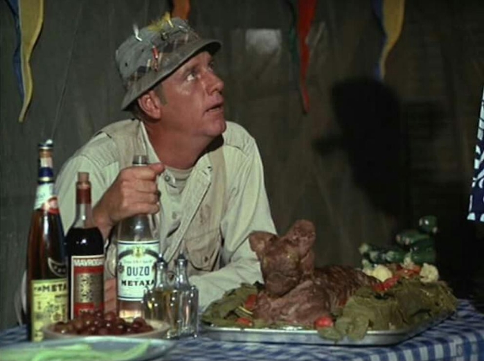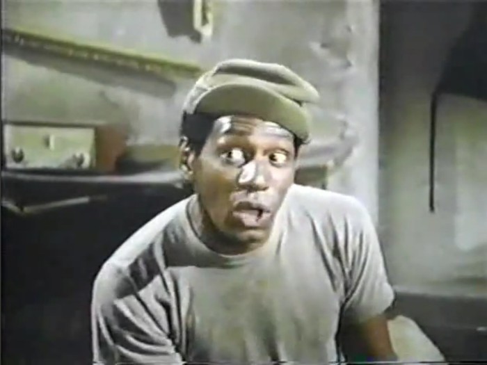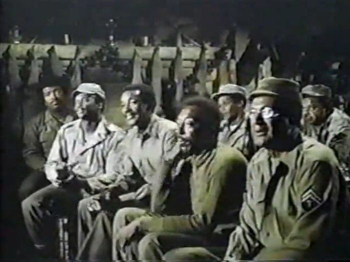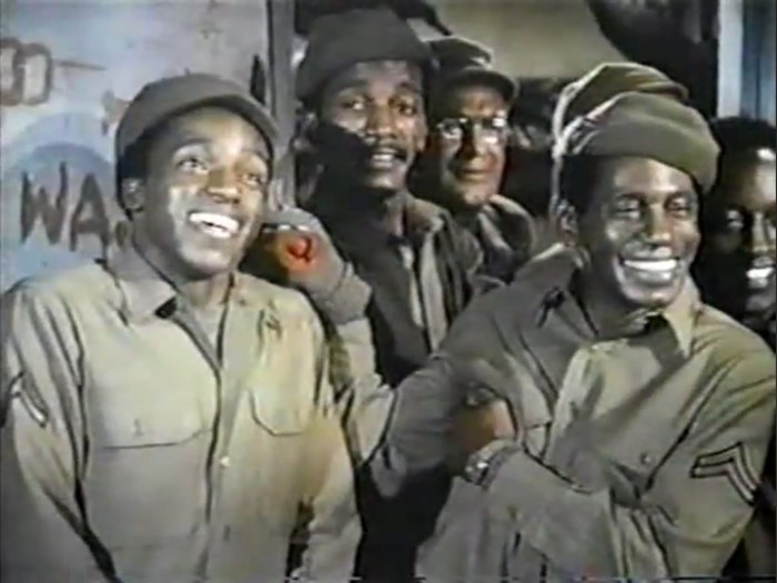 During this sequence the picture keeps cutting to a group shot of the various soldiers of the Red Ball Express seated in rows for the evenings' entertainment. The guy seated closest to the camera kept drawing my attention, not just because he was the only person in the room we hadn't previously seen, but because his features looked both out of place and somehow familiar. With a queasy feeling spreading throughout my cranky bowels, I suddenly realized who it was and what it meant: It was producer Larry Gelbart, the pasty white Jewish guy, in an uncredited cameo...wearing blackface, which should put to rest any ideas you might have that he could ever write for Black characters with anything but condescending mimicry.