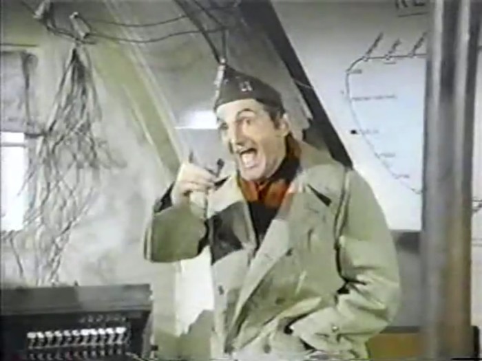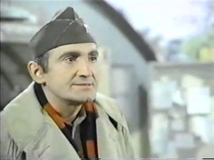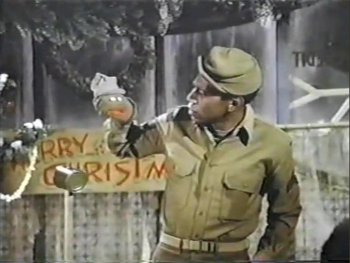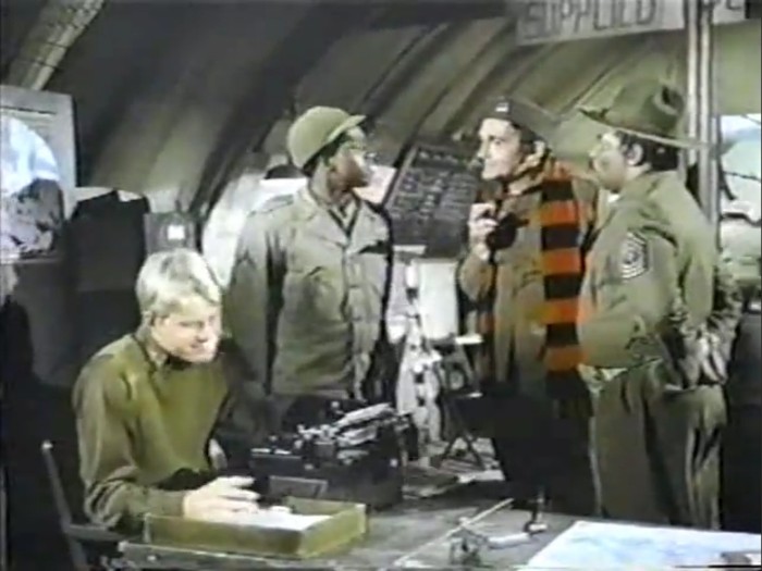 Next we catch up with our local company commander, Capt. Rocco Cavelli, a gruff Italian American with a fondness for cigars and ostentatious gesticulation, played by Val Bisoglio, a stalwart performer with dozens of gruff Italian Americans with a fondness for cigars and ostentatious gesticulation on his resume. He's dressed up in his overcoat posing for a photo he intends to send back to the States to his family. Taking the photo is his assistant, Lt. Chapman, played by Ed Begley, best known today as a cheerfully obnoxious advocate for environmentalism and sustainable living. He's part aw-shucks farm boy and part crusty old cynic, with as dismissive an attitude about Christmas as Sweet, but a quiet, boyish way of speaking that's clearly meant to draw comparisons with Gary Burghoff's Walter "Radar" O'Reilly from M*A*S*H, with the primary difference between them being that Radar was both likeable and relatable in an authentic way whereas Chapman feels wooden and soulless.