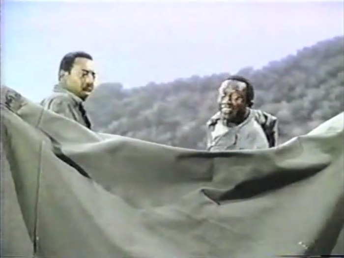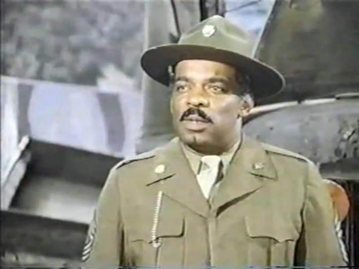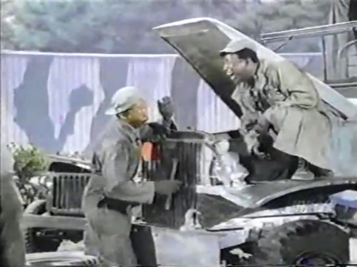 Bryant gives them more work to do and walks off past another of the supply trucks, where two pairs of feet are sticking out on rolling creepers from underneath the chassis. Bryant pulls them out to find they're just pants and shoes, and shouts for the two mechanics to get down from on top of the canvas roof where they're sunning themselves. These are High-Strung and Wheels, the company slackers, just layin' about and lazy-bonesin' like they do. Wheels, by the way, is played by Garrett Morris, for whom the show's cancellation proved a blessing in disguise, as it freed him up to join the inaugural cast of Saturday Night Live (1975-present) the following year.