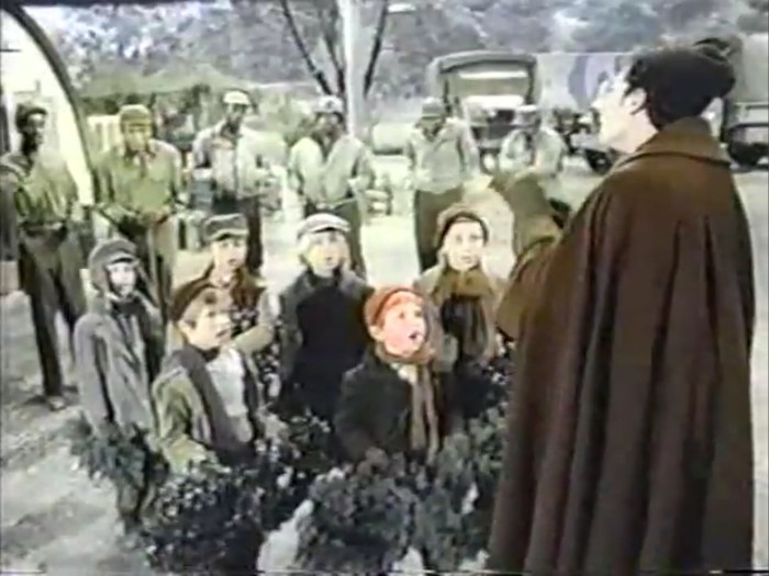 When the children complete their song there's an awkward silence as the soldiers internally reflect on this brief window of normalcy and humanity. Eventually the Friar explains that the kids are singing as a sort of advertisement to help sell their wreaths, the money from which will go to help fund their orphanage. As the men all pony up their hard-earned cash, Sgt. Bryant steps out of the mess hall, his hands firmly grasping the collars of two of the boys, who had snuck in looking to purloin a little bit of grub. The Friar apologizes and offers to give back all the men's money, but Cavelli insists he keep it, and furthermore he orders Bryant to take the whole lot of them to the mess hall and make sure they all get as much as they can eat. Bryant's sternness softens and he marches them in for their meal.