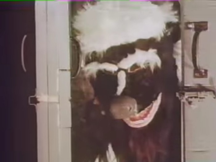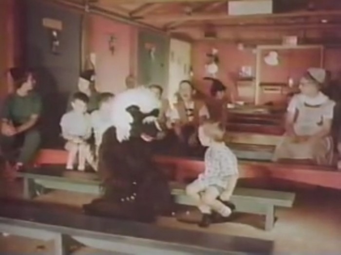 The bespoke replica pole attracts the notice of Stinky the Skunk, a horrifying full-body-costumed character that was part of the Santa's Village theme parks' varied and questionable appeal.