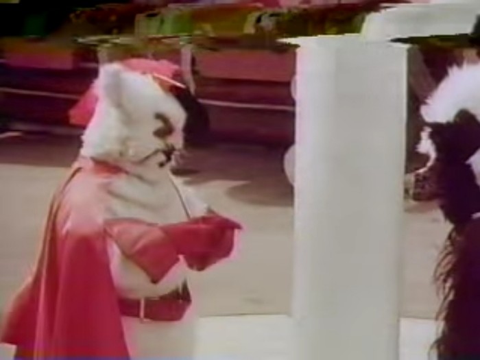 Stinky heads over to the north pole and starts sucking on it, scraping bits of the ice off into his mouth and making slurpy yum-yum noises. This attracts the notice of Puss-in-Boots, another costumed character whose connection to Christmas is, at best, obscure. Puss tells Stinky to quit it with the sloppy top on that stiff pole. It's ice, not ice cream, and besides, the official ice cream break was over an hour ago!