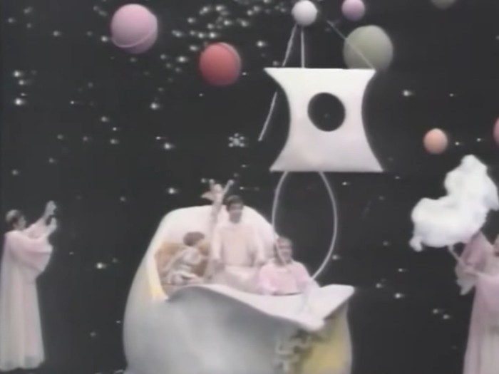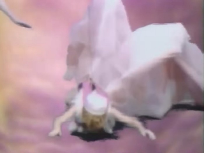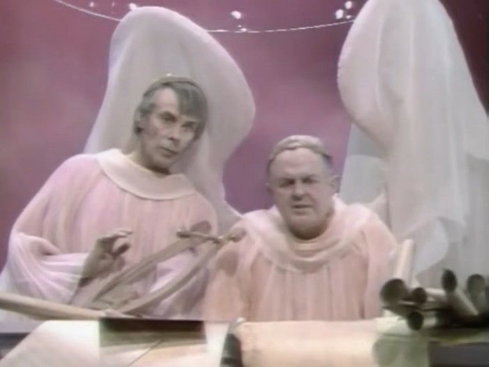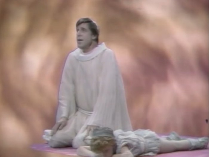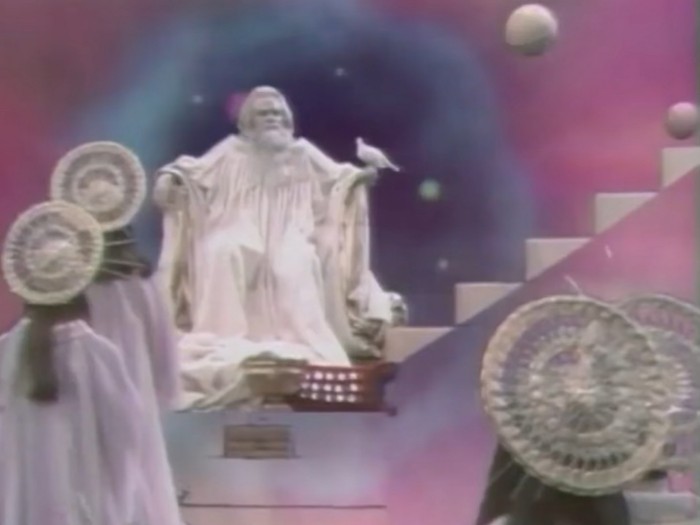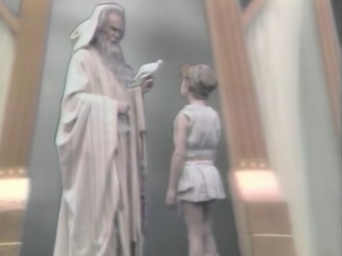 Michael walks through the gates and God disappears, leaving him alone to explore the rarefied realms of Judeo-Christian Heaven, represented here by sycophantic Angels in white robes, feathery wings and wicker halos, and some wildly heavy-handed over-use of cheesy chroma-key video effects.