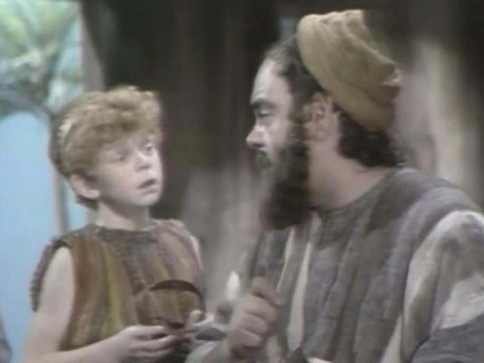 Let's meet the target. He's a little boy named Michael who's just turned eight years old and been declared by his father "a man," so he can now be left tending the family's modest flock of sheep alone while dad sews a boot, sips some wine and thinks of new and exciting ways to be a passive aggressive douchebag. Michael is inordinately proud of this new responsibility, and, as one does in a musical, he sings all about it.